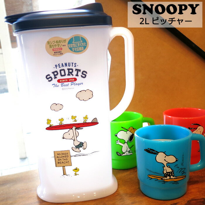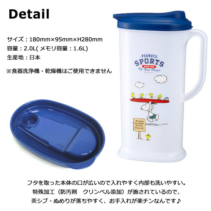 スヌーピー SNOOPY ピッチャー 冷水筒 保存容器 保管 2L 日本製 タテ置き ヨコ置き キッチン用品 キッチン雑貨 ネイビー サーフィン 麦茶入れ ジュース用 インスタ映え ダブルスリー